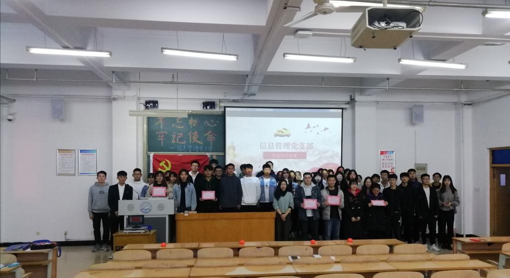 为在“不忘初心、牢记使命”主题教育中进一步做好“开门抓教育”,促进党团共建,2007so太阳集团信息管理党支部于2019年11月14日在逸夫楼B303教室举办“不忘初心,牢记使命”主题教育知识竞赛总决赛。信息管理党支部成员及120余名同学观看本次比赛。