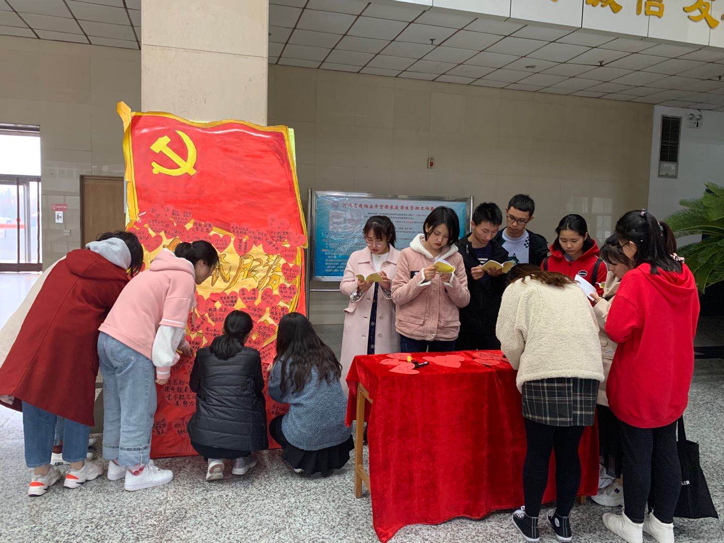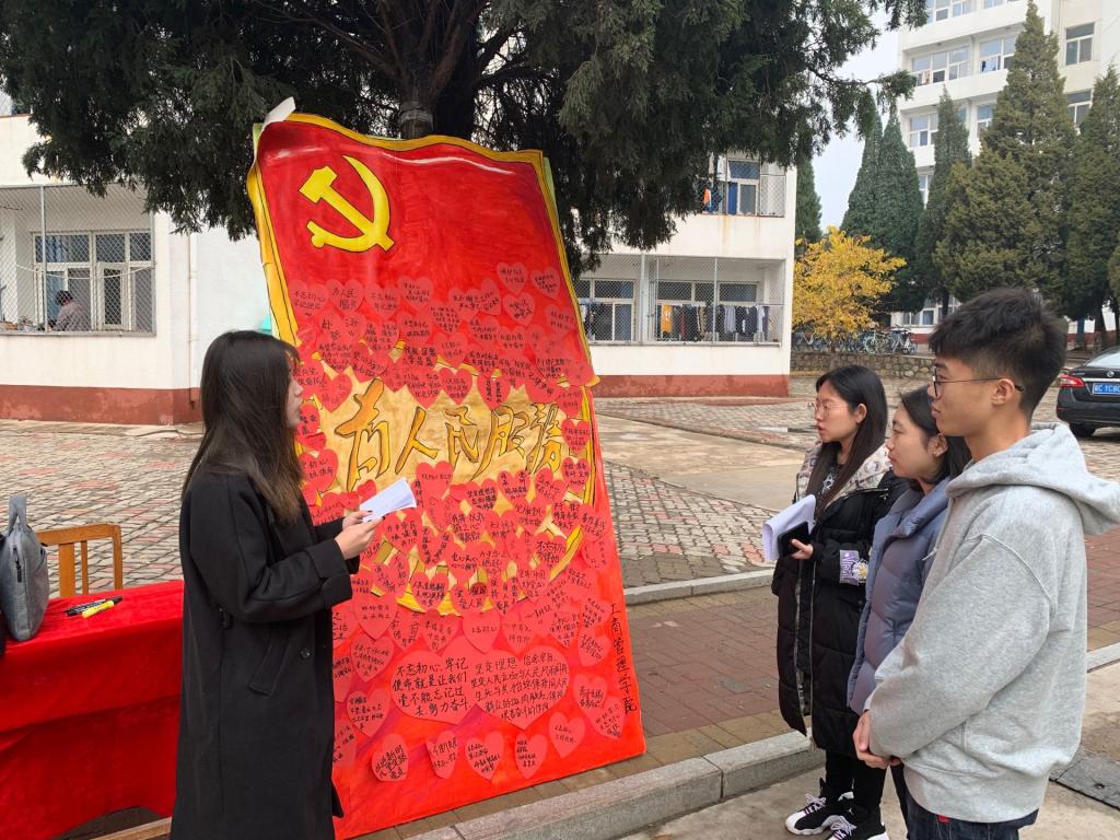 2019年11月9日-10日,信息管理党支部员工党员手持“不忘初心,牢记使命”主题教育员工手册向教学楼里及校园里来往的同学们讲解应知应会相关知识,使更多的同学对“不忘初心,牢记使命”主题教育有进一步认识,并号召同学们一起向党言心志, “我将以赤诚之心紧跟党走”、“传承党训,砥砺前行”、“守其初心,始终不变,小水长流,则能穿石”,“这是一个伟大的时代,涓涓努力都向着大海涌流”、“不忘初心牢记使命将青年梦融入中国梦”……