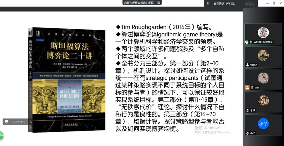 2022年11月17日下午,刘海滨副经理主持腾讯会议,数字孪生与智慧管理科研团队开展了第三次讨论活动。会上,王湘玉老师分享了“算法博弈论”领域内的一些焦点问题和重要理论。主要围绕单参数环境下的机制设计问题,基于理想化拍卖、迈尔森引理的内容和应用、算法机制设计以及收益最大化拍卖的理论进行了学习汇报。与会老师们结合各自的研究方向,对如何应用机制设计理论进行了深入探讨。刘海滨副经理对团队的学习和讨论给予了充分肯定,指出纳什均衡、机制设计等理论在计算机科学研究中的重要性,并鼓励团队成员奋发进取,互相学习交流,再此强调务必让团队成为踏踏实实做科研的科研团队。(撰稿人:王湘玉,审核人:刘海滨)