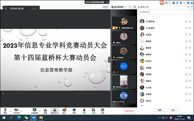 2022年11月25日晚,信息管理教学部召开了2023年信息专业学科竞赛动员大会,会议通过腾讯会议线上举行。信息管理教学部的教师、信息专业各年级全体员工参加了此次动员大会。