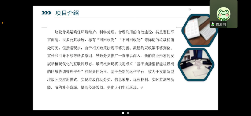 团队队长贾萧桐同学以参赛作品《基于插接型智能垃圾桶的区域协调管理平台》为例,围绕竞赛与创业的关系,分享她对于创新创业的理解;史笑晴同学从参赛项目立意的角度,说明项目更加注重考察我们同学关注社会民生、解决社会问题的能力和水平,弱化对项目商业价值的评价,我们的项目应有较高立意,积极践行社会主义核心价值观,同时建议同学们提早谋划、充分调研、做足长期准备,只有经过时间打磨孵化的项目才能经得起竞赛的考验;答辩组于雅赫同学从项目答辩的经验,指出好的创业项目要进行广泛的市场调研形成分析报告,引导同学们向可行性,创新性方向发展,着力增强将知识与实践相结合的能力。