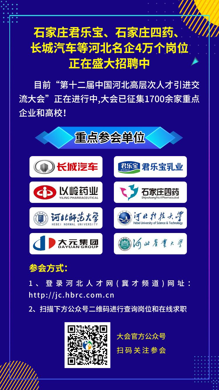 目前“第十二届中国河北高层次人才引进交流大会”正在进行中,石家庄君乐宝、石家庄四药、长城汽车、以岭药业等河北名企1700余家重点企业,4万个岗位正在盛大招聘中!请有意愿的毕业生员工投递简历,积极应聘。