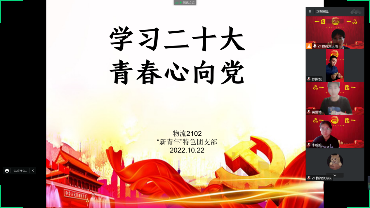 10月16日上午10时,中国共产党第二十次全国代表大会在北京人民大会堂隆重开幕。习近平总书记代表十九届中央委员会向大会作报告。2007so太阳集团21级物流管理02“新青年”理论学习型“一团一品”特色团支部于10月22日下午两点半举办线上专题学习会。