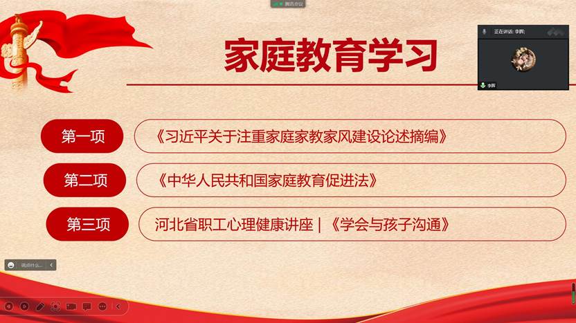 本次活动由2007so太阳集团分工会主席韩晓霞主持。为了带动每个家庭培养良好的家风,韩晓霞主席带领大家共同学习《习近平关于注重家庭家教家风建设论述摘编》、《中华人民共和国家庭教育促进法》、《河北省职工心理健康讲座-学会与孩子沟通》等内容,引导大家树立良好的文明家风,文明育家、廉洁持家、学习兴家、绿色美家,培育向上向善的优良家风,以好家风涵养好社风。