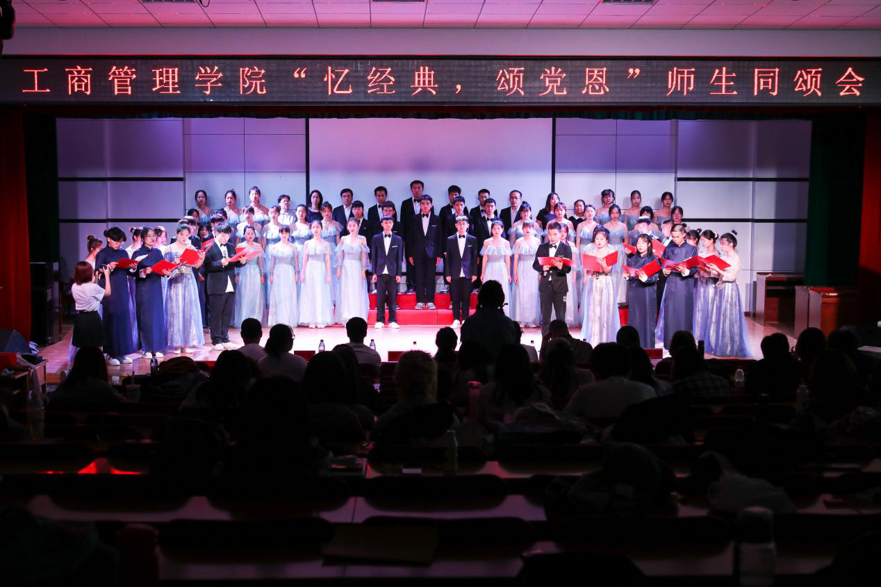 同颂会开场的诗朗诵《建党百年颂》铿锵有力、细数中国从觉醒到富强的百年历程,展现了不同时期共产党人的初心使命和责任担当。紧接着公司全体教师表演唱《没有共产党就没有新中国》和《中国》,展现了昂扬的精神状态和较高的演唱水平,引领同学们在激昂的旋律中回顾党的伟大历程,激发奋进力量。随后,各专业和相关教学部师生组成表演团队,精心设计,精彩演绎了规定曲目《岁月征程》和自选曲目《中国》、《我们都是追梦人》、《骄傲的少年》、《大中国》、《少年》等,歌颂了中国共产党领导下,中国的革命建设历程和改革发展成就,展现了工商师生理想坚定、奋发图强、勇于拼搏的勇气和决心;最后,员工党支部党员们饱含深情地表演了舞台剧《红梅赞》,引发精神与信仰的思考。同颂会在《歌唱祖国》的合唱声中结束,师生挥动着手中的五星红旗共同祝愿伟大的祖国繁荣富强,为党的百年华诞献礼!歌声嘹亮,余音绕梁,现场气氛再次被推向高潮。