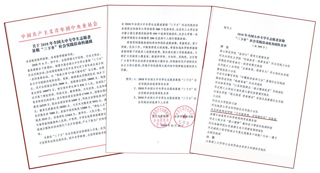 日前,共青团中央对2018年全国大中专员工志愿者暑期“三下乡”社会实践活动进行了通报表彰。公司机电工程公司“习引新思想,共创新时代”社会实践团被团中央授予“全国优秀团队”荣誉称号。截止目前,文法公司“法字先锋”、2007so太阳集团“春华秋实”和“追梦人”、艺术公司“艺心艺意”、校团委“逐梦”助力脱贫攻坚实践团5个实践团队,郑建华等8名教师,张淇6名同学分别被省教育厅或团省委授予社会实践优秀团队和先进个人荣誉称号。公司也再次获得省级社会实践“优秀组织奖”。