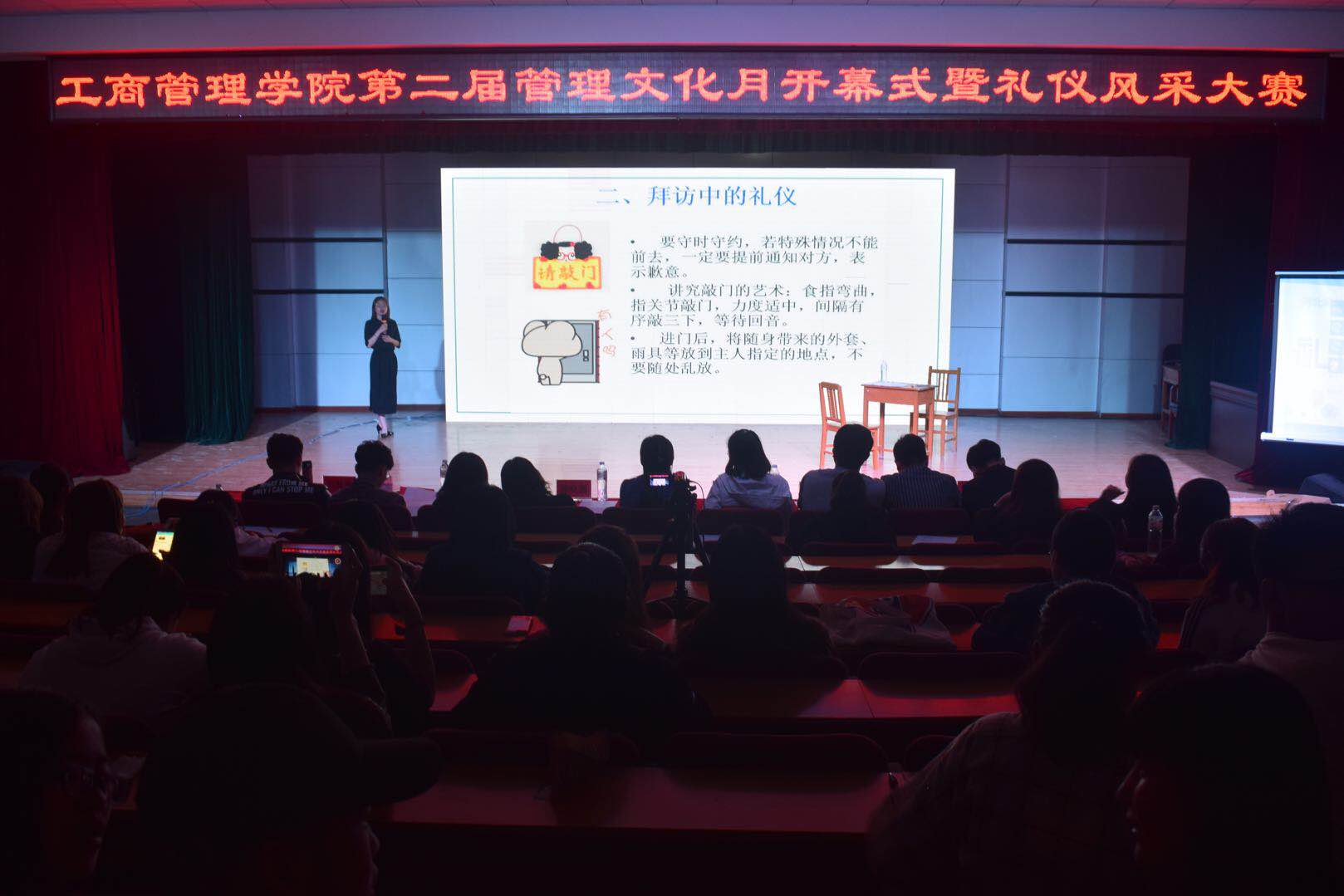礼仪风采大赛分为初赛、复赛和决赛三个环节,经过精彩角逐,共从60余人中选出8名优秀选手进入决赛。决赛共分三个环节,一是情景模拟,二是礼仪知识问答,但是个人才艺展示。